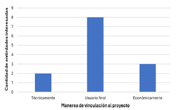 Dentro de la misión, es de suma relevancia comprender las diversas formas en que las partes interesadas pueden colaborar y asociarse con él, ya que su influencia puede variar tanto en términos positivos como negativos para su desarrollo. Por lo tanto, se planteó a las partes interesadas la pregunta acerca de cómo podrían vincularse, ya sea económicamente, desde una perspectiva técnica o como usuarios finales.