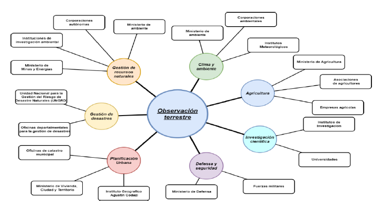 Una vez definidas estas aplicaciones, se procedió a identificar a las partes interesadas que podrían beneficiarse de ellas. Este proceso de identificación se inició con una aproximación desde una perspectiva nacional, considerando a Colombia como un actor general interesado en estas aplicaciones. Posteriormente, se profundizó en la identificación de partes interesadas específicos dentro de cada categoría de aplicación. Este enfoque de análisis holístico, que parte de una visión amplia para luego detenerse en partes interesadas específicos, proporciona una comprensión más completa de las partes interesadas en las aplicaciones de observación terrestre.