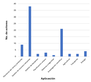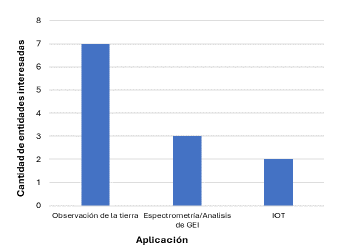 Es así como en la Figura 8 se puede claramente identificar que la aplicación que genera un mayor interés entre las entidades es la observación terrestre, seguida de cerca por el análisis de gases de efecto invernadero (GEI). Además, cabe destacar que estas entidades también demostraron tener un conocimiento significativo sobre las aplicaciones relacionadas con el Internet de las cosas (IoT).