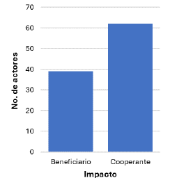 En este contexto, se procedió a categorizar a las partes interesadas en dos grupos principales: Beneficiarios y Cooperantes. Aquellos que manifestaron principalmente un interés en utilizar los recursos satelitales para sus propios fines, siendo considerados Beneficiarios. Mientras tanto, otros demostraron una disposición activa a colaborar con el proyecto, lo que las convirtió en partes interesadas altamente relevantes. La Figura 6 que muestra el número de partes interesadas por tipo de impacto, reflejando claramente una variación entre aquellos que buscarían la explotación de la información de la información satelital (39) y su contraparte que estarían dispuestos a participar activamente y contribuir a la misión (62), esto debido a que la gestión de recursos naturales implica el uso de sensores que satisfagan los requisitos de los productos esperados y la investigación científica promueve busca participar activamente brindando soluciones de ingeniería aplicada.
