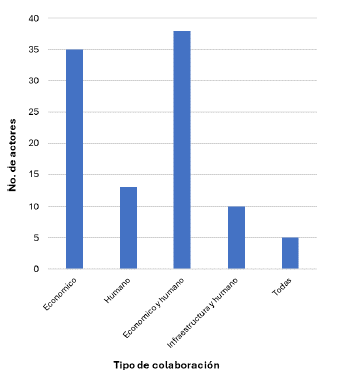 Lo siguiente fue mapear el tipo de apoyo posible desde las diferentes partes interesadas a la constelación FACSAT-3. Para este propósito se implementó un análisis con base en las capacidades de cada actor dependiendo del uso que les dan actualmente a las tecnologías espaciales. La encuesta tuvo en cuenta la manera en que la FAC analiza y plantea las capacidades como: doctrina y documentos que soportan la capacidad, organización, material y equipo, personal e infraestructura - (DOMPI) las cuales son necesarias para llevar a cabo las tareas de la institución. [18] Es así como se puede evidenciar cual puede llegar a ser el principal aporte de estas partes interesadas entre recursos humanos, infraestructura, aportes económicos, entre otros. Por lo tanto, en la Figura 7 se presenta el análisis realizado, que ilustra cómo cada actor puede contribuir activamente al proyecto de manera diversa. Se destaca que la mayoría de las instituciones exhiben una contribución significativa en términos de recursos económicos y humanos de manera paralela.