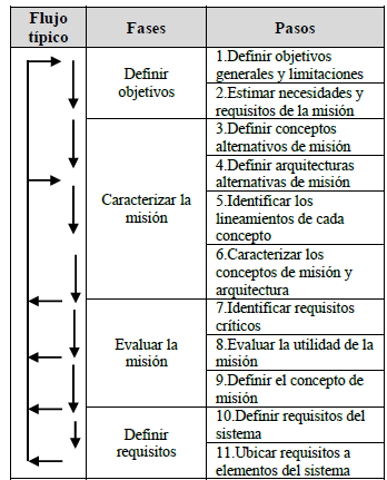 Dentro del contexto de las plataformas espaciales, como los satélites, es esencial definir con precisión su propósito, ciclo de vida útil y todos los aspectos técnicos de la misión. El libro "Space Mission Analysis and Design SMAD" de Larson se destaca como una referencia fundamental, ya que proporciona una guía exhaustiva para el diseño de misiones espaciales a través de diferentes fases, como se evidencian en la Tabla 1 [5]. El proceso comienza con la definición de los objetivos de la misión, a partir de los cuales se caracteriza la misión teniendo en cuenta todos los aspectos técnicos relevantes, estos incluyen el diagnostico de las tecnologías disponibles, el estatuto de la misión y el alcance científico, tecnológico y operativo de la misión. Una vez que la misión está caracterizada, es posible evaluarla de manera integral estableciendo los requisitos tanto del sistema en su conjunto como de sus subsistemas, como se observa en la Tabla 1, estas últimas fases se convierten en iterativas debido a que el concepto de misión y la arquitectura de los sistemas se refinan en cada evaluación [5]. Por lo tanto, el trabajo se puede retomar en cualquier punto del flujo.