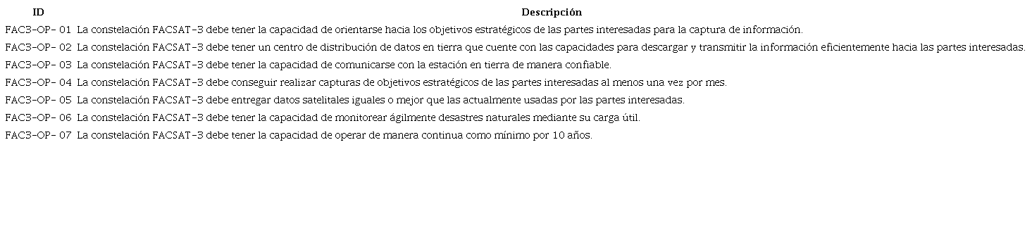 Con base en el análisis de las necesidades identificadas en las partes interesadas mencionados anteriormente, se procede al establecimiento de los requisitos de alto nivel para la misión FACSAT-3. Estos requisitos se agrupan en dos categorías principales: operacionales y funcionales. Los requisitos operacionales se refieren a los criterios que la constelación debe satisfacer durante su operación, mientras que los funcionales se relacionan con las capacidades específicas que debe poseer la constelación [17]. Para desarrollar requisitos de misión efectivos, es fundamental considerar que estos son los aspectos que la misión debe cumplir. Es decir, al finalizar el diseño de la misión, se realiza una verificación para determinar si el sistema satisface cada uno de estos requisitos, lo que permite evaluar si la misión cumple con su objetivo.