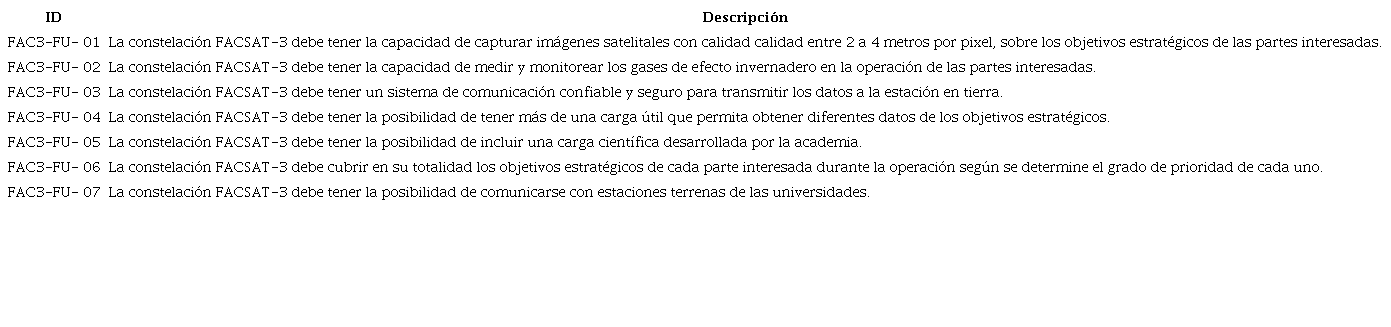 Los requisitos funcionales influirán directamente en los sistemas de la constelación. Estos sistemas deben satisfacer las necesidades de las partes interesadas interesados. Es así como los requisitos funcionales obtenidos por esta identificación de necesidades son lineamientos generales de la misión por lo que van a dar una guía para los requisitos específicos de cada subsistema. En la Tabla 4, se evidencian algunos de los requisitos funcionales para la misión FACSAT-3.