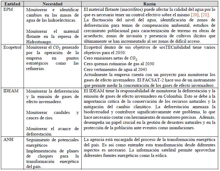 En este proceso de diálogo y colaboración, se enfatizó en comprender con mayor claridad las necesidades específicas de cada actor en relación con la misión FACSAT-3, como se detalla en la Tabla 2. Estas partes interesadas, que actualmente utilizan datos principalmente relacionados con el medio ambiente, encuentran de gran interés la mejora de sus capacidades de operación y análisis en este ámbito.