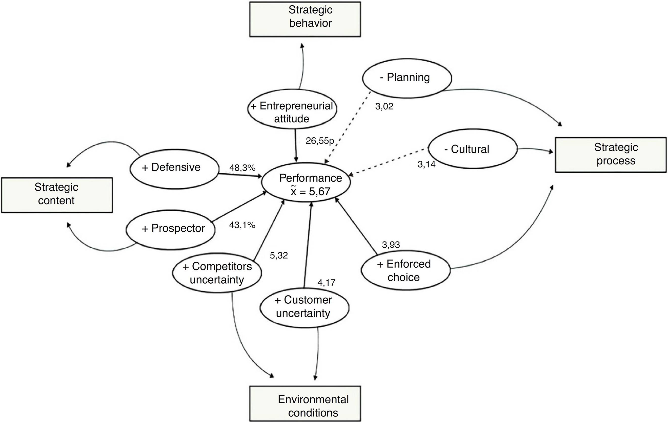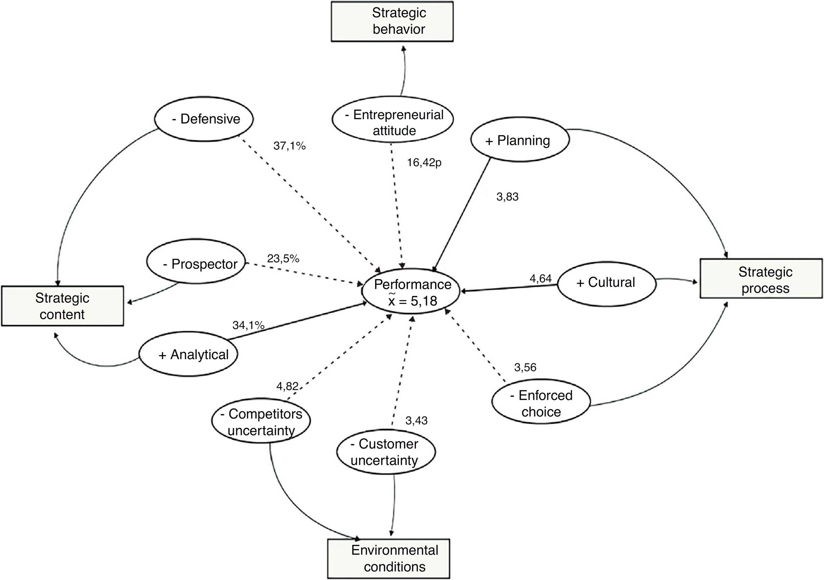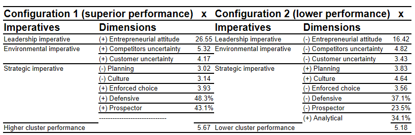 Finally, in the worst-performing configuration 2, three categories of competitive strategy were revealed: defensive strategy, accounting for 37.1%, prospector with 23.5% and analytical, 34.1%. In this instance, organizations with inferior performances have been less prospective and defensive, and more analytical than organizations with superior performances. The participation of analytical strategies ranged from 3.4% in the first cluster to 34.1% in the second cluster. On the other hand, the prospector strategies reduced their proportion from 43.1% to 23.5% and the defensive strategies from 48.3% to 37.1%.