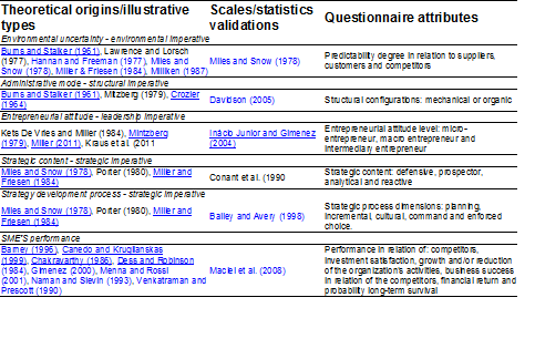 Theoretical origins/illustrative types Scales/statistics validations Questionnaire attributes Environmental uncertainty - environmental imperative Burns and Stalker (1961), Lawrence and Lorsch (1977), Hannan and Freeman (1977), Miles and Snow (1978), Miller & Friesen (1984), Milliken (1987) Miles and Snow (1978) Predictability degree in relation to suppliers, customers and competitors Administrative mode - structural imperative Burns and Stalker (1961), Mitzberg (1979), Crozier (1964) Davidson (2005) Structural configurations: mechanical or organic Entrepreneurial attitude - leadership imperative Kets De Vries and Miller (1984), Mintzberg (1979), Miller (2011), Kraus et al. (2011 Inácio Junior and Gimenez (2004) Entrepreneurial attitude level: micro-entrepreneur, macro entrepreneur and intermediary entrepreneur Strategic content - strategic imperative Miles and Snow (1978), Porter (1980), Miller and Friesen (1984) Conant et al. (1990 Strategic content: defensive, prospector, analytical and reactive Strategy development process - strategic imperative Miles and Snow (1978), Porter (1980), Miller and Friesen (1984) Bailey and Avery (1998) Strategic process dimensions: planning, incremental, cultural, command and enforced choice. SME'S performance Barney (1996), Canedo and Kruglianskas (1999), Chakravarthy (1986), Dess and Robinson (1984), Gimenez (2000), Menna and Rossi (2001), Naman and Slevin (1993), Venkatraman and Prescott (1990) Maciel et al. (2008) Performance in relation of: competitors, investment satisfaction, growth and/or reduction of the organization's activities, business success in relation of the competitors, financial return and probability long-term survival Importar tabla