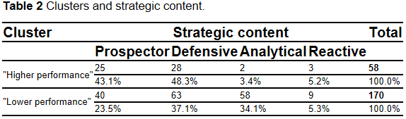 As shown in Table 2, from the 58 companies identified with the highest performance, two competitive strategies in particular stood out, respectively in the order of percentage: 48.3% adopted defensive strategies and 43.1% were prospectors. On the other hand, from the 170 companies identified with lower levels of performance, three strategies were evidenced in percentage terms, respectively: 37.1% adopting defensive strategies, 34.1% analytical strategies and only 23.5%, prospective strategies.
