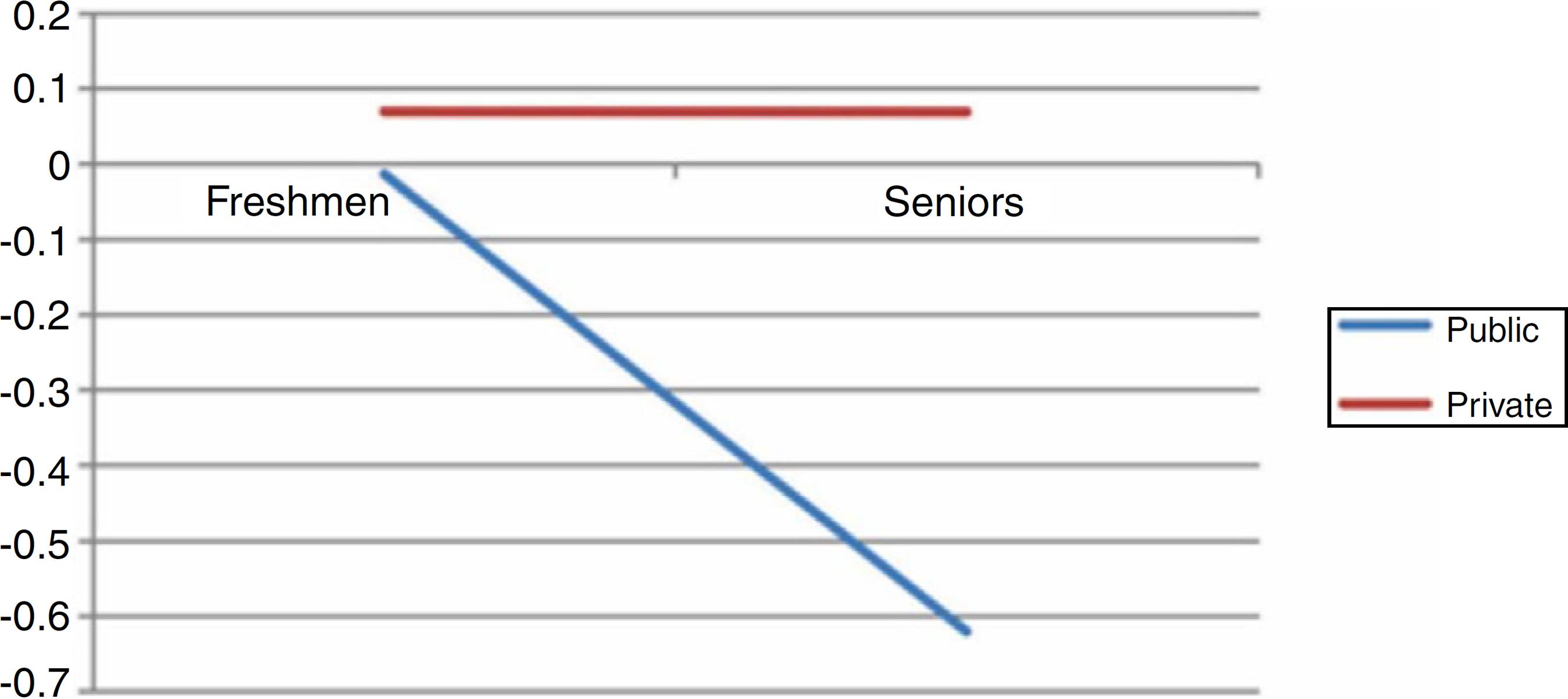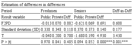 The means of all factors were higher for students enrolled in private institutions, for both freshmen and seniors. However, for while, we cannot say that these results is yielded by environmental differences between HEI. Table 4 presents the results obtained using the Difference-in-Differences Method four the four models of Eq. (1).