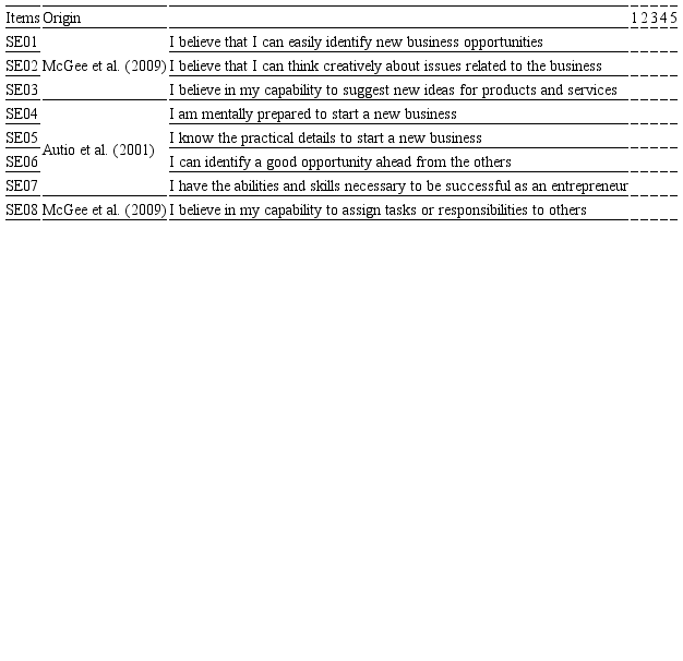 The sample comprises students from the first and the two last semesters enrolled on business administration course. Administration students were chosen because the course is regularly offered by many universities, both public and private. Moreover, administration students are familiar with entrepreneurship since they chose an academic career which is very close to the theme. Before the final application of data, the measurement instruments were build up from scales already existing in the literature (see item 3.2 in this section). After the instruments had been devised, they were tested with students in the middle semesters of business administration courses in one of the federal universities included in the sample. This evaluation was carried out in two steps and from them, changes were performed in the way the questions were proposed. Unsuitable questions were excluded in order to measure the constructs of interest.