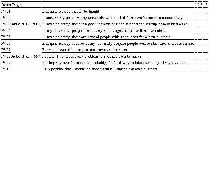 Since a single standard instrument valid to measure entrepreneurial intention or its preceding factors was not found, we decided to devise a questionnaire including items found in several studies. The full instrument is in the appendices with details about sources and scales. In general the items were measured by 5-point likert scale, varying from 1 (totally disagree/highly unlikely) to 5 (totally agree/highly likely). Entrepreneurial intention (EI) was based on 8 questions, while Perceived Social Norms (SN), Perceived Desirability (PD), Perceived self-efficacy (SE) and Perceived viability (PV) were based, respectively on 7, 15, 8 and 18 questions.