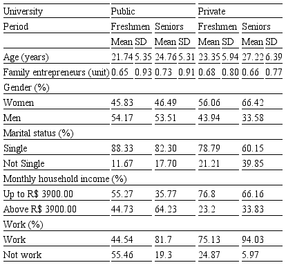 The total sample comprised 566 students, from which, 332 students are in private HEI, with 198 enrolled in the first semester of the course (Freshmen) and 134 in the two last semesters – from the seventh semester on (Seniors). 234 questionnaires were applied to the public HEI students, from which 120 were enrolled in the first semester (Freshmen) and 114 in the last three semesters (Seniors). Table 1 shows the descriptive characteristics of the sample regarding type of university and period.