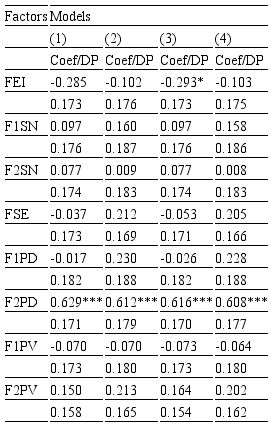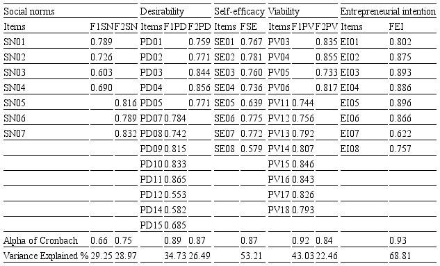 The factor analysis on the items for measuring the Perceived Social Norms (SN), Perceived Desirability (PD) and Perceived Viability (PV) was unable to produce a single factor for each dimension. The first factor resulting from the dimension Perceived Social Norms (F1SN) represents the opinion of relatives, friends and important people about the possibility of the respondent to become an entrepreneur. The second factor (F2SN) corresponds to the importance the students give to these opinions.