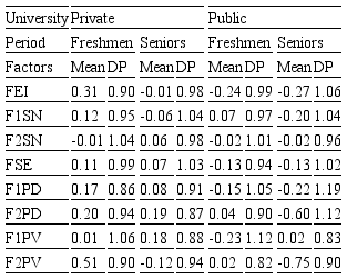 After this step, the factors extracted from each dimension of the model proposed by Krueger et al. (2000), the means of each factor and their respective standard deviations were analyzed into four groups – the public and private university students; and – the stage in the course (freshmen – those in the beginning) and (seniors – those next to the end of the course. This analysis enabled the verification of the individuals’ perception regarding each factor and the differences between public and private students in the two periods under consideration.