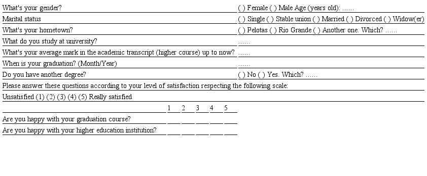 The survey was carried out through the application of a questionnaires in three traditional public universities in the State of Rio Grande do Sul (one in the city of Rio Grande, one in Pelotas and one in Porto Alegre). These universities were founded in the 1960s and their business administration courses are in existence for over ten years. The private universities (also three, two in Pelotas and one in São Leopoldo) are among the first ones acting in the State and in the metropolitan region of Porto Alegre. The business administration course is among the most popular in each of the universities and already exists for over ten years.