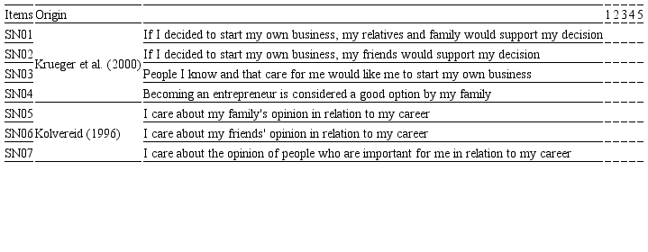 Social norms (SN) are defined as the degree by which close people to the future entrepreneur accept the entrepreneurial choice as a career option. This acceptance reflects the influence of an organizational and/or social culture and provides guidance for what is considered acceptable in specific culture. Granovetter (1973) emphasizes the importance of social networks for several types of human entrepreneurship, in which they would play a vital role in the entrepreneurial process, insofar they could guide and facilitate, as well as constraint or inhibit certain opportunities.
