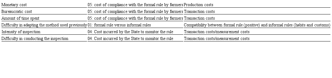 Proposition 05 is related to the costs affecting the economic agents, defined as: The higher the cost to comply with the formal rule by the economic agents, the lower its level of enforcement. This proposition is related to the transaction and monetary costs incurred to comply with certain law. For a farmer to comply with the law, it may be necessary to modify its production model, thus incurring costs, direct and administrative costs. In the presence of positive costs, the incentive to comply with a certain law/rule falls. Often, there are levels of compliance or levels of enforcement of the law (which consists of several rules). Thus, it is possible that the farmer complies with a certain rule that makes up the law but not others. Therefore, there are levels of compliance with the laws.