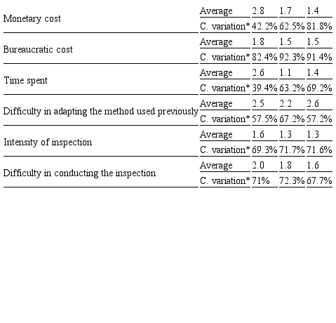 With respect to the monetary cost, the average of the answers was the index of 2.8 with coefficient of variation of 42.2%. The bureaucratic cost, which sought to, along with the amount of time spent, capture the transaction cost, obtained an average of 1.8 with a coefficient of 82.4% for the entire sample, a wide variation. The amount of time spent indicated an average of 2.6 with a coefficient of variation of 39.4%. With respect to the difficulty of adapting the previous practices to the current practices, the average of the sample was 2.5, with a coefficient of variation of 57.5%. As for the intensity of inspection, the average was 1.6, with coefficient of variation of 69.3%. With regard to the difficulty for the inspection body do conduct its work in the opinion of producers, the average was 2.0, with coefficient of variation of 71%. In all of the above items there was no statistical difference17between the averages of sugarcane producers and cattle farmers. In addition, a correlation matrix18 between the variables associated with propositions 01, 04 and 05 (Chart 01) and the variable representing the compliance (or not) with the rules studied (obtained through the questions in Chart 02) was made. For this norm there was no significant correlation19 between the variables representing the propositions and the dependent variable.