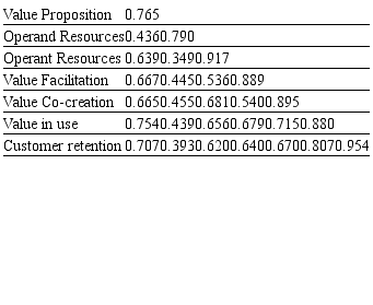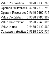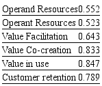 Consequently, it has been verified that 78.9% of the variation of Customer retention is explained by its independent variables: Value in use, Value Co-Creation, Value Facilitation, Operating Resources, Operand Resources and Value Proposition. 84.7% of Value in use variability is explained by Value Co-Creation, Value Facilitation, Operant Resources, Operand Resources and Value Proposition. 83.3% of Value Co-Creationvariability is explained by Operating Resources and Value Proposition. 64.3% of Value Facilitation variability is explained by Operand Resources and Value Proposition. 52.3% of Operant Resources variability is explained by Value Proposition. 55.2% of Operand Resources variability is explained by Value Proposition. As it is obvious, the presented results suggest a high explanatory power of Customer retention in the aspect of determining constructs inserted in the proposed Theoretical Model.