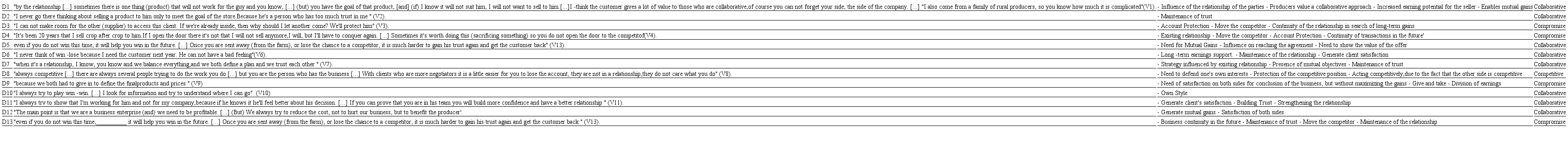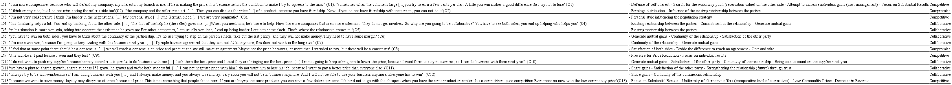The same analysis was made for the responses given by buyers (farmers). Firstly, the excerpts from the transcribed interviews were analyzed, and initial codes were identified. In addition to the initial codes, an analysis was made on the strategy that each negotiator adopted based on the interpretation of the initial responses and codes identified. As well as in the analysis of the sellers, the use of three strategies was also identified: collaborative, compromise and competitive. Fig. 12, highlighted in Appendix B of the paper, presents the consolidation of these analyzes.