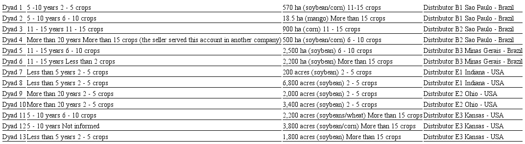 Each negotiation presents unique characteristics, however, to broaden the discussion of the results, negotiation dyads in different companies were chosen, since each inputs distributor may have characteristics that affect the negotiations conducted. Consequently, three companies in Brazil and three companies in the United States were selected. For each of them, two dyads were chosen, except one company in the United States where three dyads were analyzed. The distributors (companies) did not follow the criterion of convenience, but of purposeful choice (Pratt, 2009), to strengthen data collection. In this way, we opted for companies that had well defined management practices and sales controls. The choice of distribution channels participating in the research was made with the assistance of two specialists in agricultural inputs distribution in Brazil and with the support of two specialists in the study of agricultural inputs distribution in the United States.