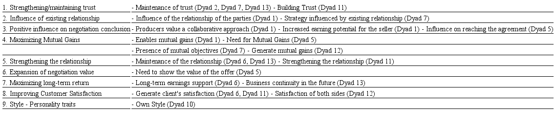 Moreover, it is observed that the existing relationship between the parties may impact on the seller's choice of collaborative negotiation strategy, since there is a relationship of trust that allows the discussion of the interests of the parties, seeking to reach the results which are satisfactory to both sides: "when it is a relationship, I know, you know, and we balance everything, and we both define a plan, and we trust each other" (Seller dyad 7).
