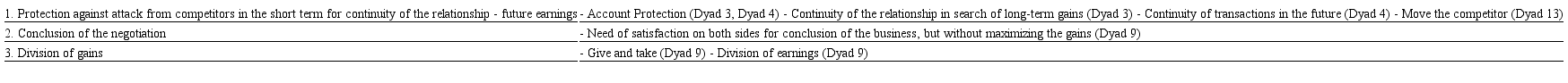 Another passage shows that the negotiator, due to the long relationship with the other party, may have entered the negotiation seeking a collaborative position. However, as a strategy of protection against the attack of competitors in the short term for the continuity of the relationship, the negotiator may have adopted a compromise strategy. "Sometimes it is worth doing this (sacrificing something), so you do not give access to the competitor" (Seller Dyad 4).