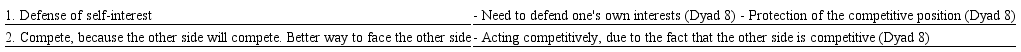 Finally, the competitive strategy appears on the part of the seller at times when the improvement of short-term results is necessary, or when the negotiator has to defend his own interests: "Always competitive [...] there are always several people trying to do the work you do [...] but you are the person who has the business [...] With clients who are more negotiators it is a little easier for you to lose the account [...] they do not care what you do" (Seller dyad 8). It is also observed that competitive posture may be a strategy used in situations in which the seller expects the other side to adopt a competitive attitude.