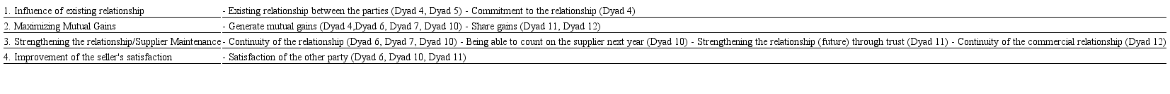 Fig. 4 shows the categories that motivate the use of the compromise strategy. Two major categories can be highlighted: long-term maximization of return and the need to reach an agreement and complete the negotiation.