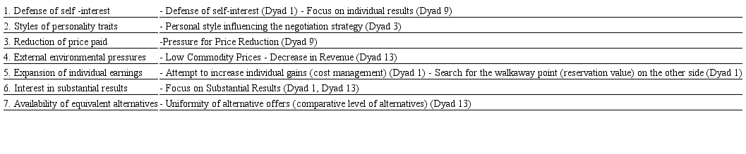 Thus, it is possible to highlight the use of competitive strategy by buyers. This strategy was verified in four dyads: 1, 3, 9 and 13. Among the reasons found, the defense of one's interests, the availability of equivalent alternatives, the reduction of prices paid on inputs, interest in substantial results, or the need to reduce costs, can motivate the use of this strategy. These results confirm the conclusions of Ramsay (2004) and Zachariassen (2008), highlighting that even in relational contexts negotiators can use distributive strategies.