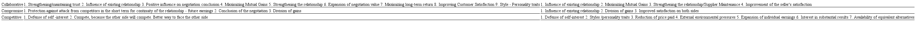 To begin the analysis, Fig. 9 presents a summary of the main reasons that led buyers and sellers to define their negotiation strategy. It is noted, on both sides (buyers and sellers), the use of strategies of collaborative, competitive and compromise.