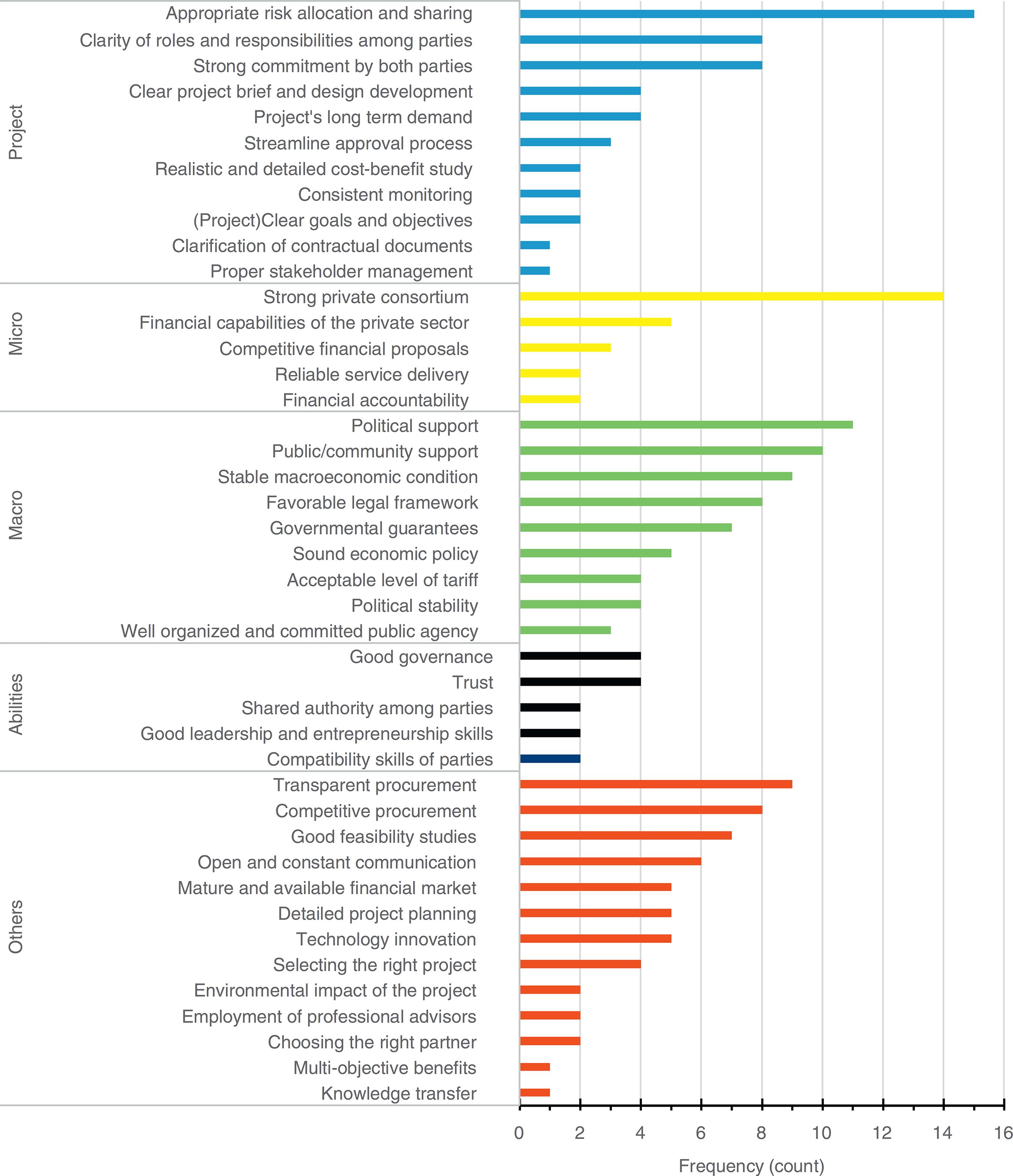 Based on previous studies (Osei-Kyei & Chan, 2015), CSFs in PPPs are related to the quality of the relationship established between parties. Fig. 1 presents a list of CSFs in the PPP context. The list is grounded in the previous literature review by Osei-Kyei and Chan (2015) from 1992 to 2013. We added more two articles (Aerts et al., 2014; Chou & Pramudawardhani, 2015). The original list of the other 27 articles can be viewed in Osei-Kyei and Chan (2015).