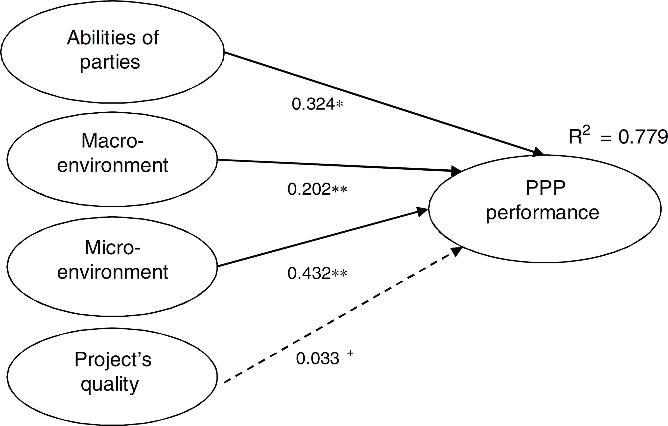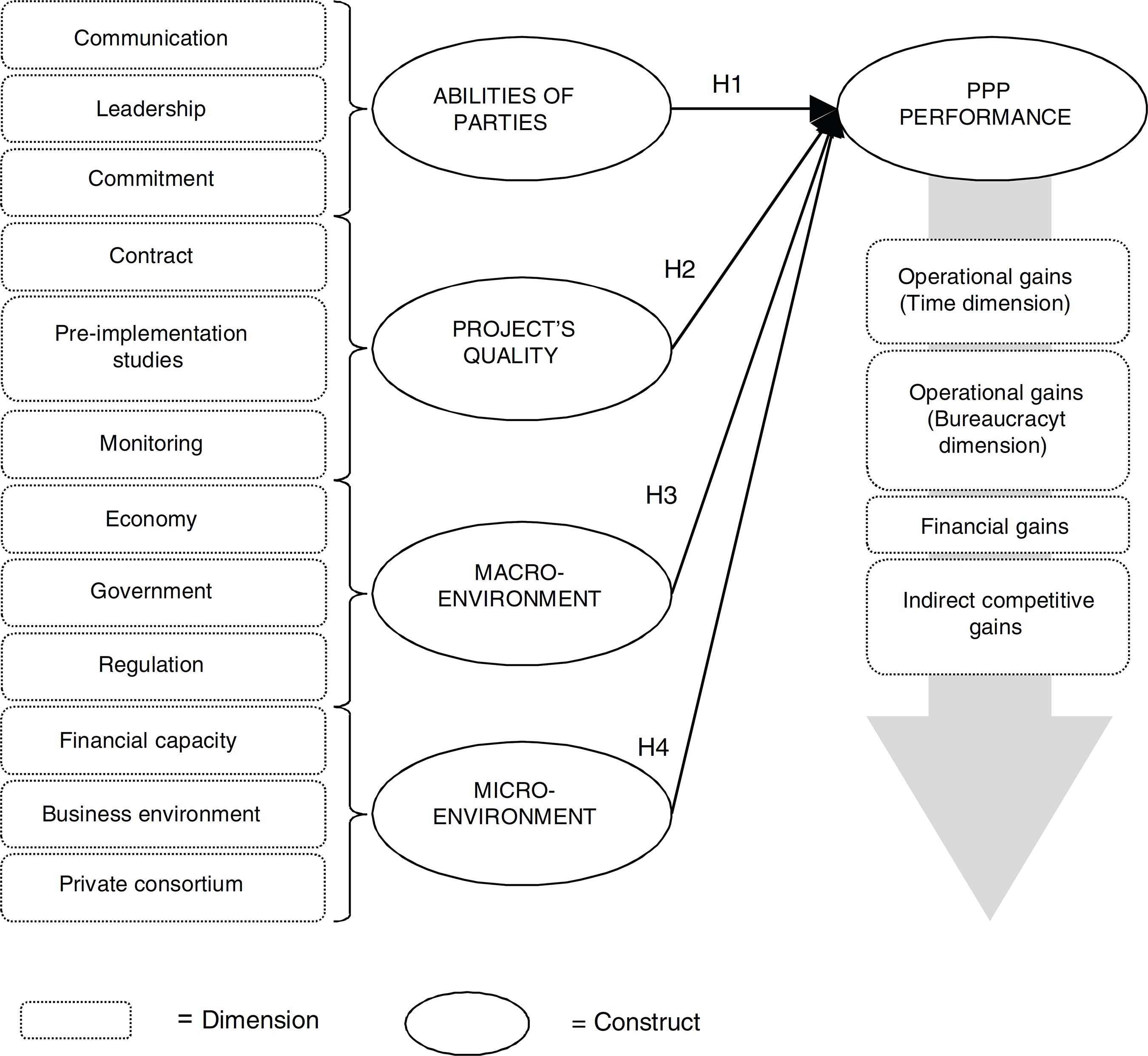 The model presents reflexive indicators (Abilities of Parties, Macro-environment, Micro-environment and Project's Design) and one formative indicator (PPP Performance); thus, each indicator should be evaluated according to adequate criteria.
