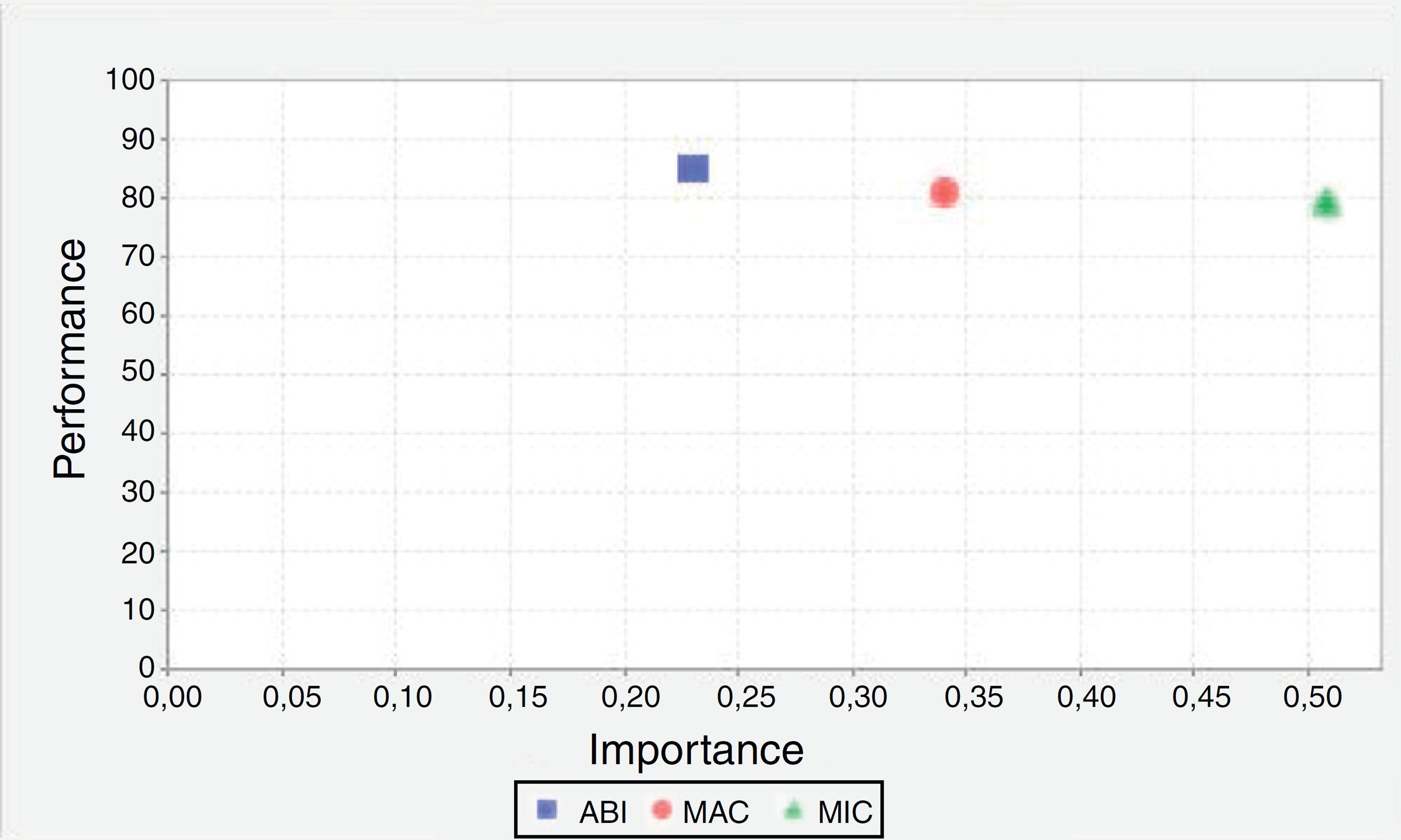 The IPMA emphasizes that the most important construct of the model is the Micro-environment, followed by the Macro-environment, then the Abilities of parties. Regarding the performance indicators, all have approximate values, indicating adequate performance in relation to the model.