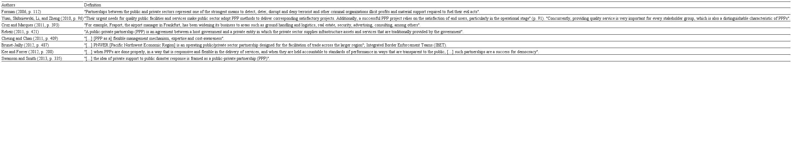 PPPs are a long-term contract between a private and a public party for the provision of public services or goods. In this type of relation, the private initiative takes upon itself most of the risks involved in the project since it assumes the role of the government in providing the specific public service to the population (Lopes & Caetano, 2015). On the other hand, not every PPP is oriented towards the execution of infrastructure projects. Some partnerships are established for the provision of a service. Although not widely discussed in the literature, these types of partnerships can be viewed in the papers shown in Table 1.