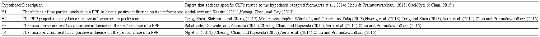 According to the literature review (third column) and the original problem, we worked with the following hypotheses to design the model (Table 2).
