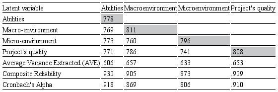 According to Hair et al. (2013), the criteria for evaluating reflexive measurement models are: (1) internal consistency (compound reliability); (2) the indicator's reliability; (3) convergent validity (extracted mean variance); and (4) discriminant validity. On first analysis, all indicators were used in the constructs' measurement. The evaluation of convergent validity was performed by means the average variance extracted (AVE). Only the latent variable of the "Micro-environment" presented an AVE less than the minimum recommended by Ringle, Sarstedt, and Straub (2012) of 0.5. Thus, the indicators that presented the lowest loads on the construct were excluded, and a new adjusted model was obtained.