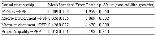 Student's T statistic analyses the hypothesis that the correlation coefficients are equal to zero. In case the results of this test indicate values above 1.96, the hypothesis is not supported, and the correlation is significant (Efron & Tibshirani, 1998; Hair et al., 2013). Table 4 presents the values of the coefficients between the constructs and the respective Student's T statistic. Values were also estimated by the bootstrapping technique. All relationship values presented Student's T values above 1.96 (significance level = 5%), except the "project's quality" construct, which presented a T value of 0.198, which is not significant.