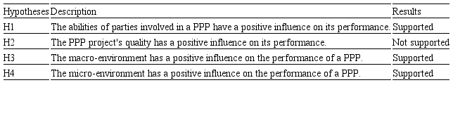 The most influential construct was the micro-environment. Osei-Kyei and Chan (2015) developed a study in which they analyzed the most discussed CSFs in the academic literature spanning from 1990 to 2013 (inclusive). In their paper, "appropriate risk allocation and sharing" and "strong private consortium" were the two most discussed critical success factors in the literature. Both were considered to be micro-environment factors when the research group was developing the conceptual model, which would be validated later. Therefore, it is not surprising that the micro-environment has such a strong relation with the performance of partnerships. Other papers that address specific CSFs regarding the micro-environment can be found in Tables 2 and 3.