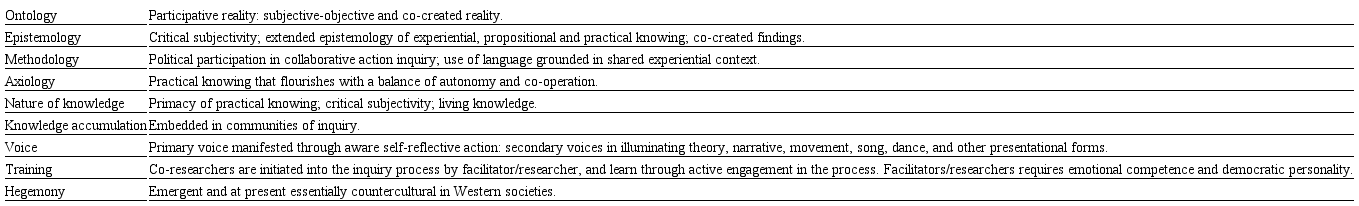For reasons of length, I cannot present in this essay a full account of participatory inquiries methodologies. I end my text by providing two important elements to colleagues and graduate students seeking to engage with participative methods. The first is a summary of the philosophical assumptions of participatory inquiry (Table 2), according to the view of Heron and Reason (1997). As previously mentioned, there are different schools under the umbrella called participatory or action-based research. The view proposed by the authors is probably prominent, but does not cover all the different possibilities in terms of positioning within the broad paradigm.