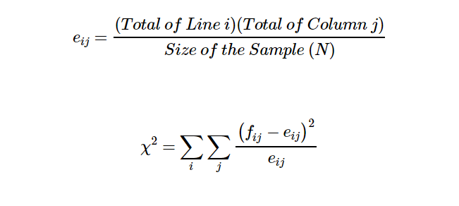 where eij is the expected frequency based on the independence hypothesis for the category in Row i and Column jof the contingency table and fij is the frequency observed for the category in Row i and Column j of the contingency table. When we analyze two groups and binary responses, the test statistic has approximately a chi-square distribution for large samples with one degree of freedom.