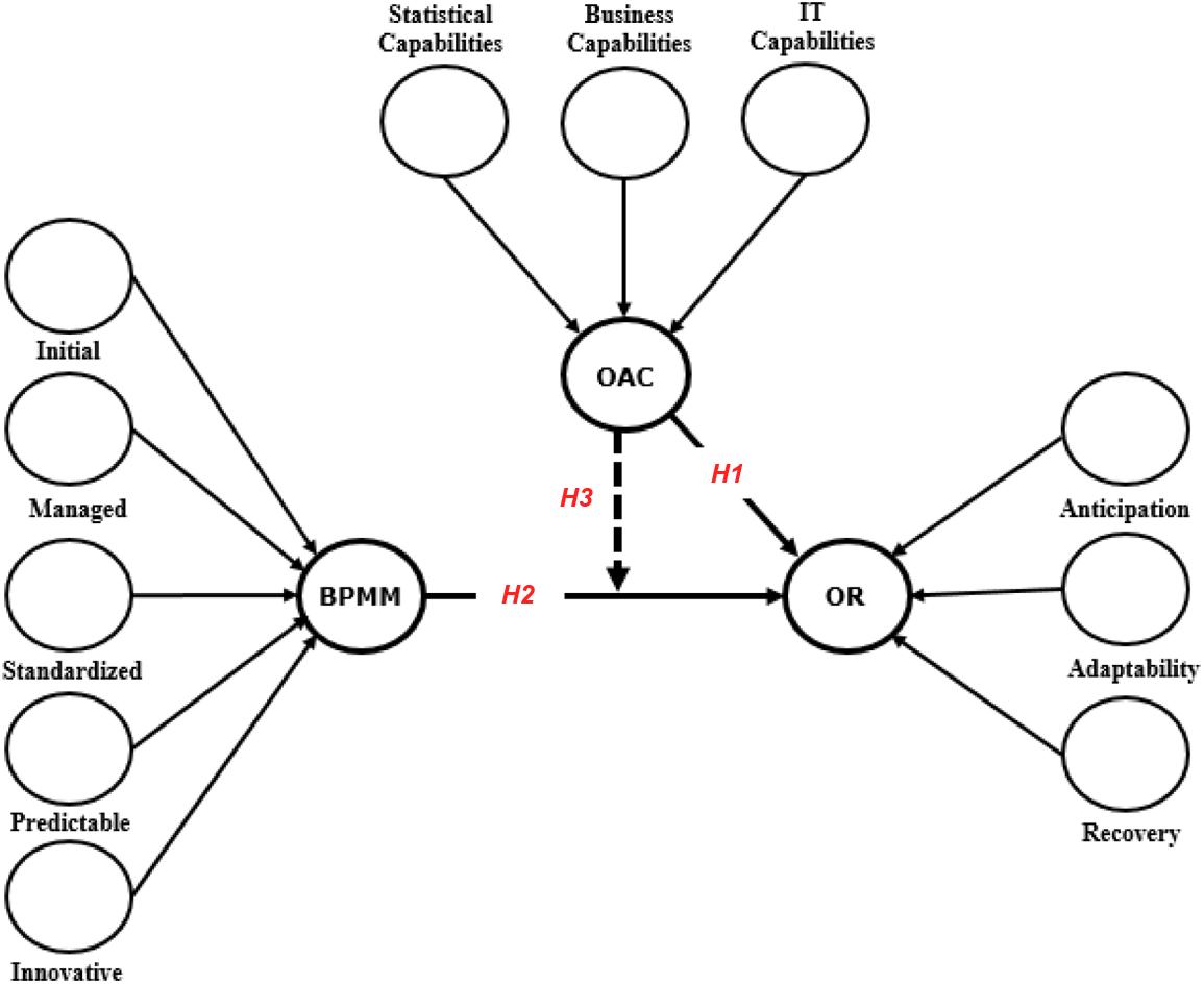 When collected, aggregated and synthesized information comes from the execution of processes, it is inferred that, specifically, the prediction and risk analysis capabilities – inherent to OAC (Acito and Khatri, 2014; Fahimnia et al., 2015) – lead companies to better prepare for unexpected or disruptive situations by modifying their business processes to adjust to the changes imposed by the environment, thus ensuring full adaptation and recovery from disruptive events that have occurred and, ultimately, positive results in terms of OR.