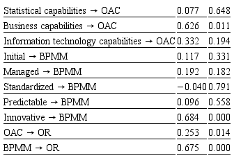 However, based on the evaluation of the coefficient of determination (R2), it was verified that a 1 per cent variation in the OAC and BPMM constructs is responsible for causing a variation of 80.4 per cent in the endogenous construct of OR. It follows that if a manager wants to develop the analytical capabilities in a company and therefore matures the management of the business processes, then the manager should use efforts to improve capabilities, particularly in business (inherent in the capacity to identify problems, formulate and implement solutions, perform the decision-making process based on data and facts and develop expression and communication that are compatible with the business environment), maturing their processes towards more innovative management practices in which business processes are more flexible and continuously improved – in this case, the innovative level – because the continuous reformulation of routines and lagged procedures results in developed activities more efficiently. As a result, the OAC and BPMM can act as medium- and long-term performance drivers, helping companies design and develop new process capabilities and, over time, improve competencies and competitiveness standards.