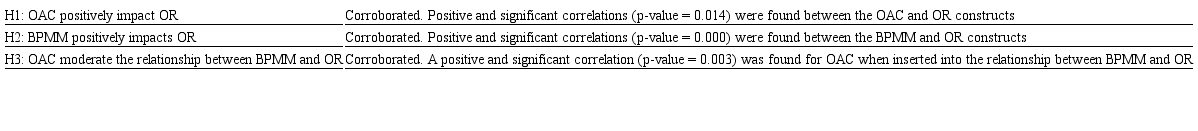 Based on these assertions, it is inferred that if BPMM impacts the performance of the organization, then it can be considered that the same maturity is related to OR because when measured, it represents one of the types of performance results.