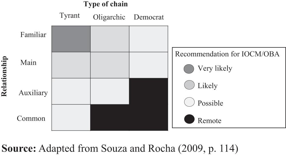 Concerning this phenomenon, Souza and Rocha (2009) – although without clearly mentioning the automotive sector – note that the type of chain (tyranny, oligarchy and democracy) in which the company is inserted allows to verify higher or lower probability of IOCM application and, consequently, OBA. Practicing both processes is more feasible in tyrant or oligarchic chains, because of their main characteristics. In these types of chains, the tyrant or oligarchic company may address such processes. Therefore, the more the company presents characteristics similar to the chain of tyranny, the more likely and viable will be the application of the IOCM and the OBA.