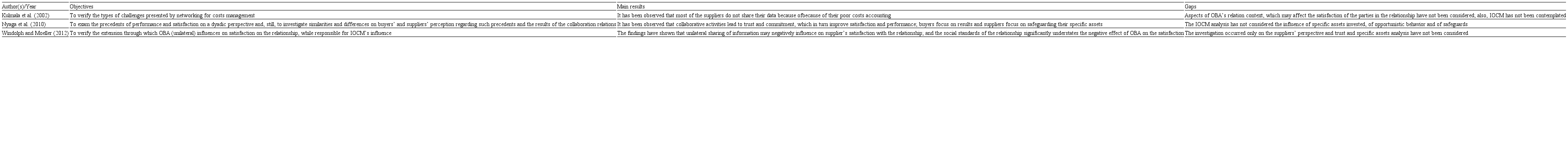 As per Table I, there is a lack of studies on the influence of OBA and trust on the satisfaction of the parties concerning interorganizational relationship, considering if such influence depends on other factors of the relation context. Only three studies have considered satisfaction in the relationship (Kulmala et al., 2002; Nyaga et al., 2010; Windolph and Moeller, 2012). Table I shows the objectives, results and gaps presented on the above-mentioned studies.