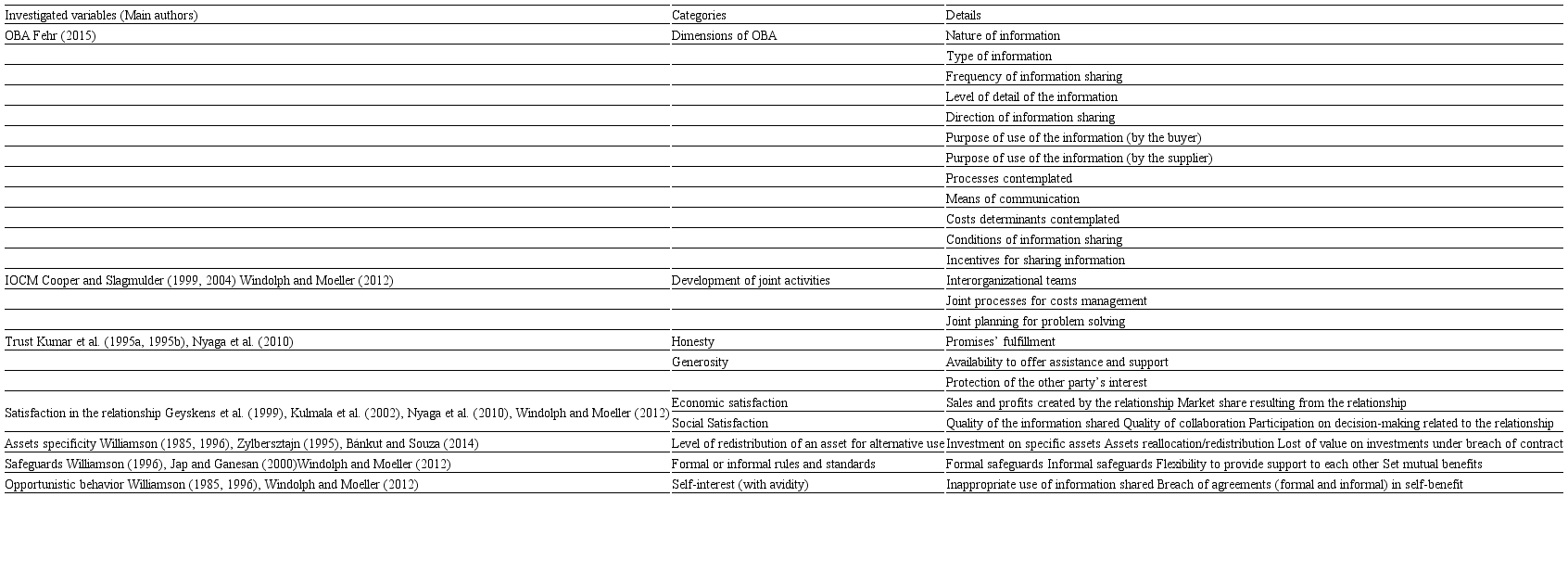 Alenius et al. (2015) ensure that OBA plays a key role in the establishment and management of closer relationships between buyers and suppliers. DhaifAllah et al. (2016) confirm it when they verify that OBA, as well as IOCM, enhance interorganizational relationships mainly when the parties establish interrelated safeguards to repress opportunistic behavior.