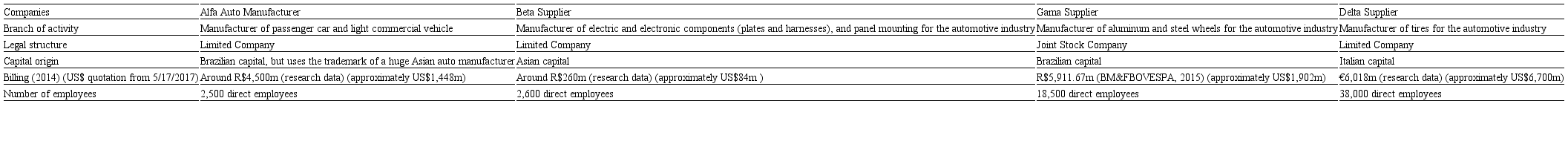 One auto manufacturer and three direct suppliers were analyzed as the study aimed at conducting an investigation on a dyadic relation. The choice of companies was intentional (non-probability sampling). Although the auto manufacturer is not among the biggest ones of the sector in Brazil, this company has important representativeness, even because of its brand.