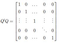 In addition, the Q matrix is also orthonormal, as the length of each vector is 1, which can be denoted by ‖qi‖ = 1. Being orthonormal, these vectors (i.e. the columns of the Q matrix) are positioned in different directions and form a 90° angle to each other. Thus, the vectors [q1, q2, … , qn] form a linearly independent set, serve as a basis for a vector space and can form any other vector, in this same space, from the linear combination of their terms.