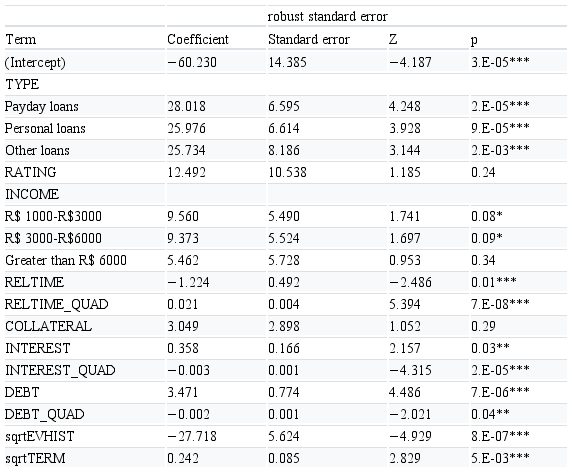 The variables COLLATERAL, lnDEBT, INCOME (greater than R$6,000) and TYPE (other loans) are not statistically significant.